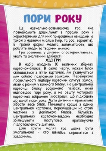 Пазли логічні “Пори року”. У набір входить 10 великих збірних карток-блоків. У свою чергу, кожен блок складається з п’яти карток, які з’єднуються між собою пазловимі замками. На центральній картці блоку зображені ілюстрації, які підходять до даної фігурі. Мета дитини – правильно зібрати весь блок.