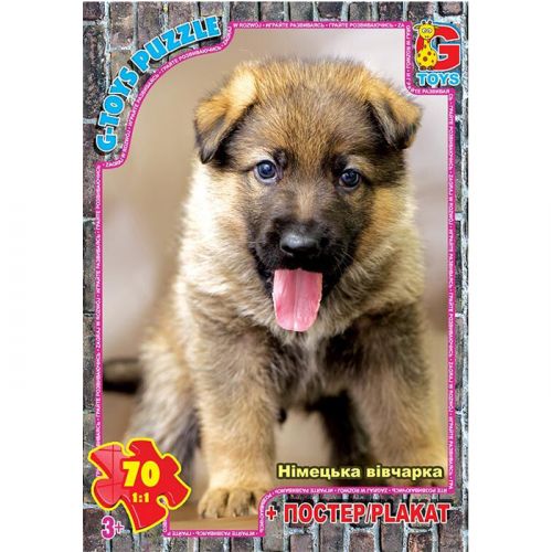 Яскраві пазли на 70 деталей з фотографією милого цуценя німецької вівчарки. Розмір картинки: 30 х 21 см. Розвивають логічне мислення, дрібну моторику рук, усидливість. Постер у подарунок. Для дітей віком від 3-х років.