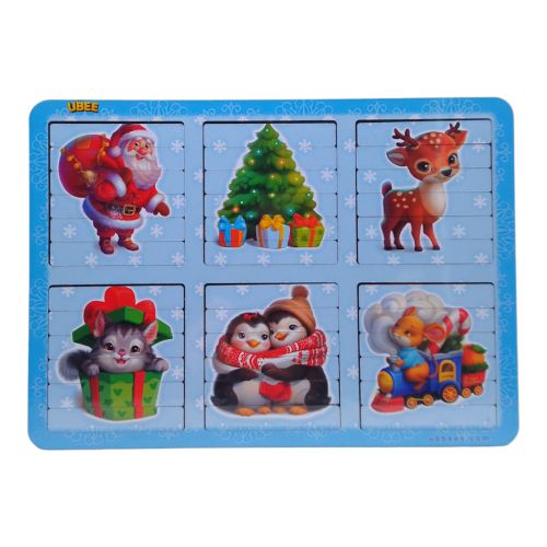 Деревʼяні двосторонні пазли-вкладиші у незвичайній формі. Деталі малюнків виконані у формі паличок. Кожна картинка складається із 6-ти елементів. На звороті кожного малюнка криється ще один рисунок. Всього з “Новорічного” набором пазлів дитина зможе скласти цілих 12 картинок.
