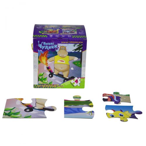 Пазли 4 в 1 “Веселі чудики”. У набір входять 4 пазла для самих маленьких, на 4,6, 9 і 12 деталей. У готовому вигляді все картинки мають розмір 25 х 25 см, у пазлів відрізняються розміри деталей. Розвивають логічне мислення, дрібну моторику рук, посидючість.