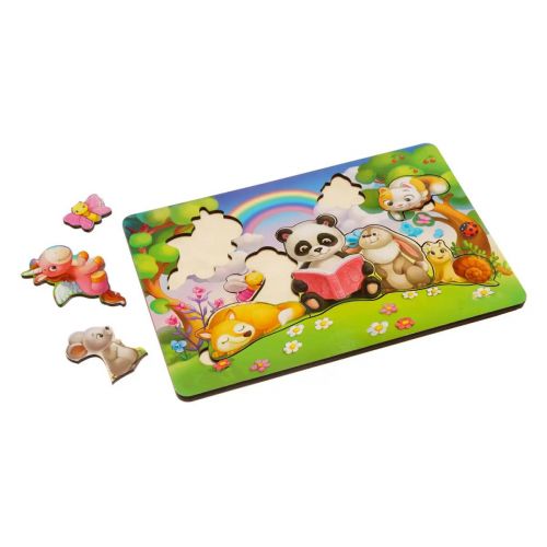 Зоопазл складається з 9-ти звірів-вкладишів, які сидять на лісовій галявині. Все деталі пазла зручно діставати пальчиком і вставляти назад за формою і тематикою малюнка. Виготовлено із якісних та екологічно-чистих матеріалів. Розмір рамки: 23х16 см. Виготовлено в Україні.