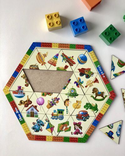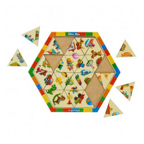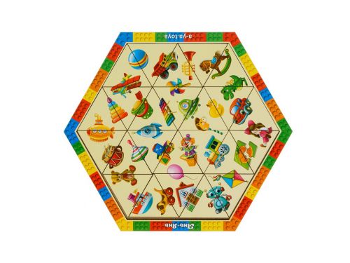 Пазл-головоломка з деталями у вигляді трикутників, а сама основа (рамка) – це шестигранник. Потрібно зібрати пазл з усіх трикутників так, щоб вийшла картинка. Розмір рамки – 26,5х23 см.