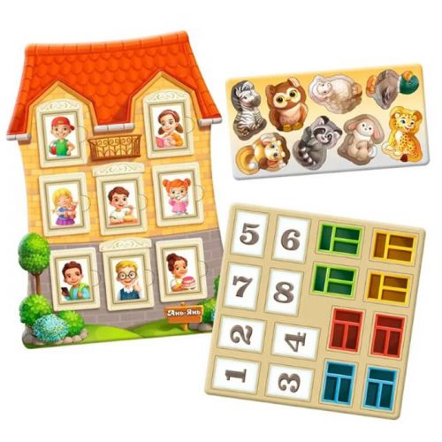 Пазл-сортер “Будиночок із завданнями” – у цьому будиночку зібрані ігри на різносторонній розвиток дитини. В ігровій формі розвиваємо зорову та слухову пам’ять, дізнаємося про домашніх та диких тваринок, тренуємо словник, рахуємо.