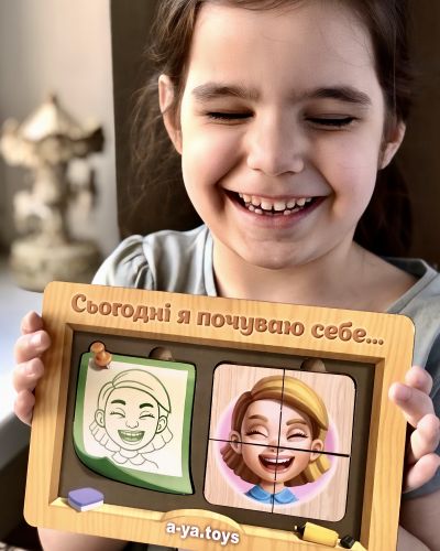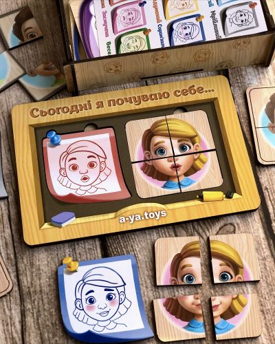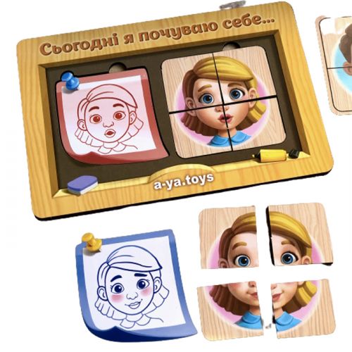 Комплектація: Пазл-сортер 36 деталейта 9 плашок із графічним зображенням емоцій