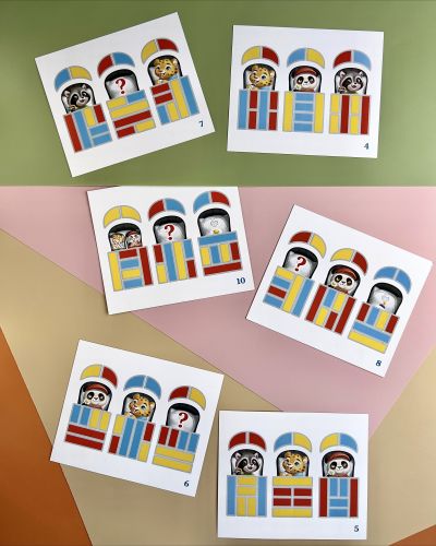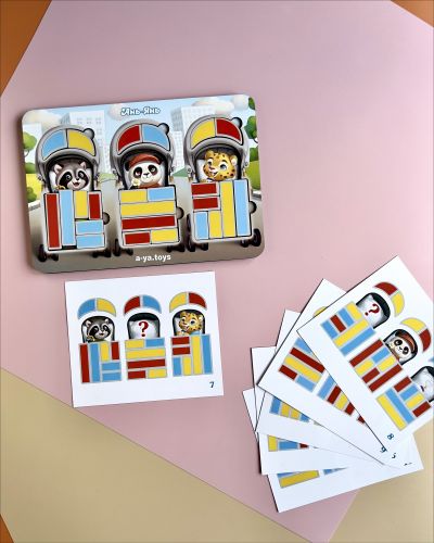 Двошаровий пазл-сортер. у наборі: 27 деталей та 12 карток. Милі звірятка сидять у всіх колясках вкриті ковдрами. Завдання дитини розкласти звірів, ковдри та козирки колясок за зразком, вказаним на картці.