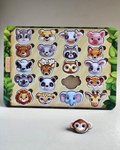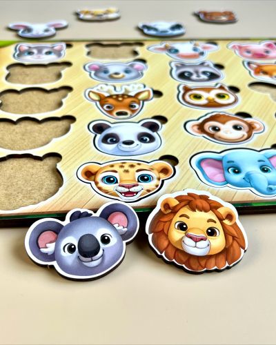 Пазл-сортер “Мордочки” – на планшеті знаходяться 20 милих мордочок різних тварин.Порахуйте звірів та поговоріть з дитиною про те, що вона знає про щит тваринок. Сортуйте тварин на диких та домашніх, великих і маленьких. Мордочки зручно діставати пальчиками і вкладати в основу за індивідуальною формою.