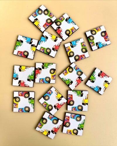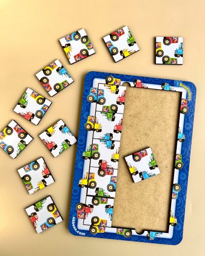 Деталі у вигляді квадратів. Потрібно зібрати пазл з усіх квадратів, на яких намальовані частини різнокольорових тракторів. Можна також рахувати трактори та вивчати кольори і напрямки.
