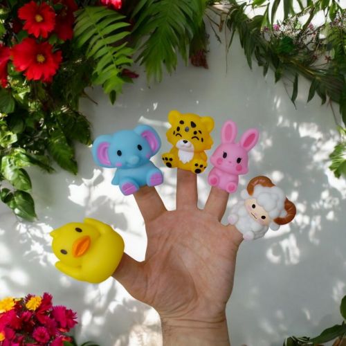 Набір з пʼяти гумових тваринок на пальці для домашнього лялькового театру. Пальчикові лялькові театри є уявною виставою, де актори використовують ляльки, насаджені на пальці, щоб розповісти цікаву історію. Пальчикові лялькові театри широко використовуються в освітніх цілях для дітей, оскільки вони сприяють розвитку моторики, уяви та мовних навичок.