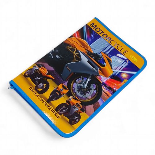 Велика папка на блискавці. Формат А4. Стінки виконані із щільного картону. На внутрішній частині є спеціальні кріплення резиночками для зошитів або канцелярського приладдя.