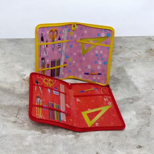 Велика папка на блискавці. Формат А4. Стінки виконані із щільного картону. На внутрішній частині є спеціальні кріплення резиночками для зошитів або канцелярського приладдя.