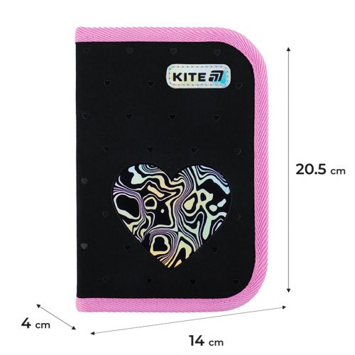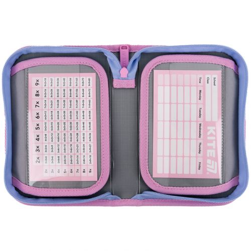 1 відділення, 2 відвороти, резинки для фіксації канцелярії, розклад, таблиця множення, з наповненням (точилка, гумка, лінійка 15 см, фломастери, олівці кольорові, олівці графітні, ручка кулькова автоматична, ножиці 13 см), декор: голографічний та об’ємний друк