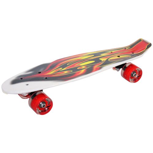 Пенні Борд зі колами, що світяться при їзді. Легка дека виготовлена з міцного формованого пластику. Має протиковзну поверхню. Довжина деки – 55 см, ширина – 14,5 см. Колеса PU, зі світлом, d=6 см. Підвіски: алюміній. Максимальне навантаження – 70-80 кг.
