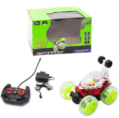 Іграшкова машинка-перевертень із серії “Автопром” має передню вісь, яка крутиться на 360 градусів, що дозволяє йому виконувати запаморочливі трюки при їзді. При виконанні трюків, щоб не перевернутися, машинка оснащена додатковими колесами. Розмір машинки – 17х17 см., Діаметр коліс – 7 см. Виконаний з якісного пластику. Для дітей від 3-х років.