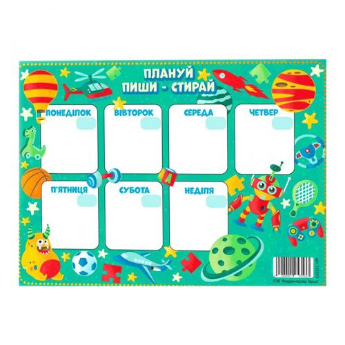 Зручний картонний планер на тиждень для дитини. Гладка поверхня картону дозволяє легко прати маркери або фломастери, тому планер можна використовувати багаторазово. Розмір: 17х23 см.