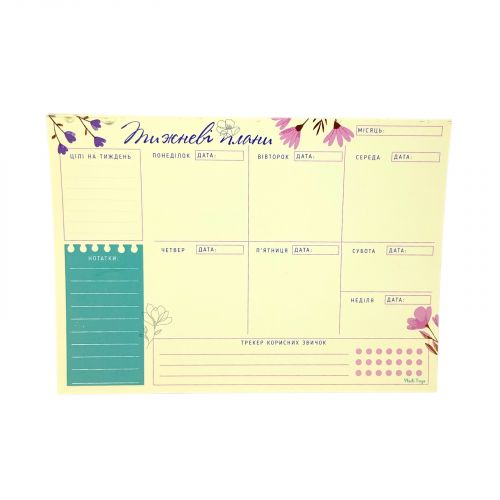 Зручний планер на тиждень для дітей та дорослих. Завдяки продуманому дизайну можна розписувати плани не тільки на тиждень, а й додати додаткові цілі чи важливу задачу в окреме поле де її буде найкраще помітно! В комплекті присутньо 54 аркуші — тож планера вистачить аж на 378 днів! Розмір одного листа 20 х 14,5 см.