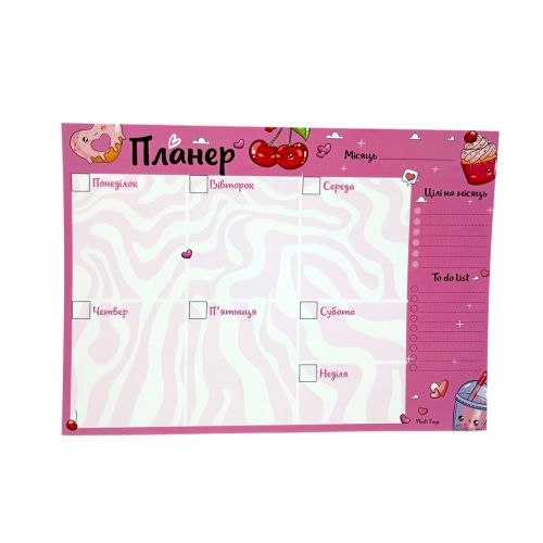 Зручний планер на тиждень для дітей та дорослих. Завдяки продуманому дизайну можна розписувати плани не тільки на тиждень, а й додати додаткові цілі чи важливу задачу в окреме поле де її буде найкраще помітно! В комплекті присутньо 54 аркуші — тож планера вистачить аж на 378 днів! Розмір одного листа 20 х 14,5 см.