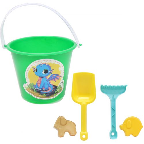 Пластиковий набір “Дракоша“. У наборі є: відерце, 2 формочки для піску, грабельки, лопатка. Довжина лопатки – 18 см. Грабельок – 14,5 см. Виконано з якісного пластику.