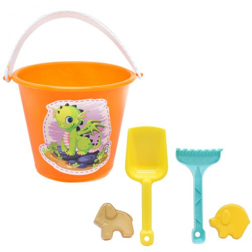 Пластиковий набір “Дракоша“. У наборі є: відерце, 2 формочки для піску, грабельки, лопатка. Довжина лопатки – 18 см. Грабельок – 14,5 см. Виконано з якісного пластику.