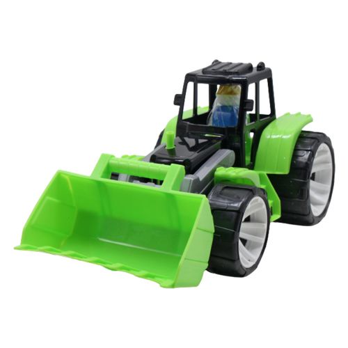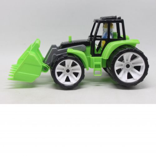 Пластиковий трактор з ковшем. Рухомий ковш. Всередині трактора розташована фігурка робочого, готового до пригод на фермі або будівельному майданчику. Дитина може вигадати різноманітні сценарії гри, де цей трактор використовується для виконання різних завдань та розвиває творчий підхід до гри.