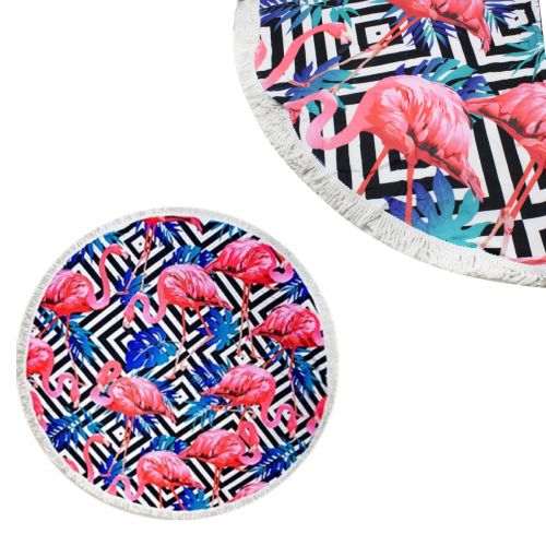 Пляжний килимок – відмінний аксесуар для відпочинку на свіжому повітрі. Виконаний з якісного, приємного на дотик матеріалу. З яскравим принтом, прикрашений бахромою. Діаметр килимка – 145 см.