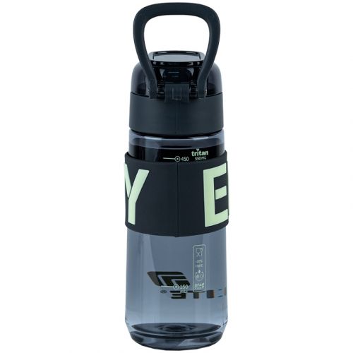 Пляшечка для води виготовлена з тритану. Тритан – надійний, міцний, безпечний пластик без запаху та смаку. Особливості: • об’єм 550 мл — оптимальний для активного дня; • безпечний тритан, без BPA; • герметична кришка з кнопкою відкривання; • зручна силіконова вставка-тримач — не ковзає в руці; • пластикова ручка — для зручного перенесення; • лаконічний дизайн із написом — виглядає круто і дарує настрій