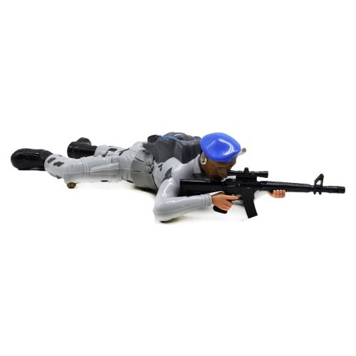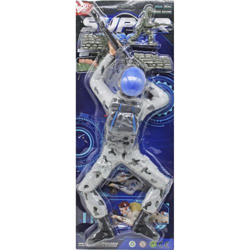 Оригінальна пластикова іграшка-солдат сподобається дитині. Іграшка працює на батарейках. Оснащена звуковими та світловими ефектами – звуки стрілянини, підсвічування дула та шолома. Солдат повзає по рівним поверхням, може долати невеликі перешкоди. Розмір іграшки 40х14 см. Також у наборі є маленька пластикова фігурка солдата та декорації – мішки з піском. Працює від 3-х батарейок типу АА (немає в комплекті).