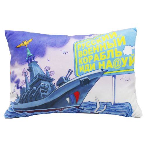 Сувенірна подушка із зображенням російського воєнного корабля та всім відомої фрази, що пролунала у його адресу. Сувенірна подушка стане чудовим подарунком та прикрасою інтер’єру. Розмір: 35х27 см.