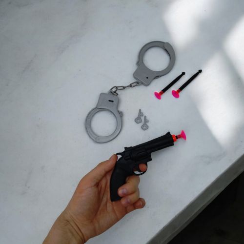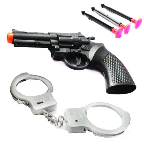 Поліцейський набір. В комплект входить пістолет, 3 снаряди з липучками та наручники. Для вистрілу треба вставити снаряд та натиснути на гачок. Все виготовлено з якісного пластику. Чудово підійде для веселих ігор в поліцейських з друзями.