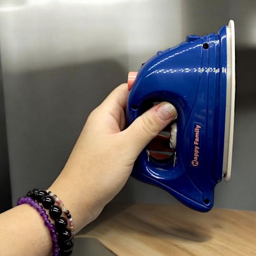 Дитяча праска “Happy Family”. Працює від 2-х батарейок АА (немає в комплекті). Знизу на прасці розташована кнопочка, при натисканні якої іграшка починає вібрувати. Таким чином, вібрацію можна відчути в процесі прасування, якщо притиснути праску до одягу. Також оснащений спреєм. Щоб його використати, потрібно заповнити резервуар усередині праски водою. Розмір іграшки: 16х17х7 см.