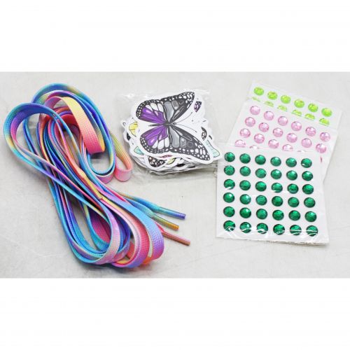 Набір прикрас для взуття. Завдяки такому набору кожна маленька модниця може створити унікальний дизайн свого взуття. Набір містить дві пари стильних шнурків для кедів або кросівок, різноманітні наліпки та три комплекти з різноколірними стразами, що легко клеяться на будь-яку поверхню. Варіанти використання аксесуарів на взутті необмежені.