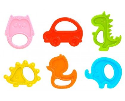 Прорізувач міцний, гнучкий та абсолютно безпечний для малюка. Особлива форма дозволяє дитині самостійно тримати іграшку однією рукою. Допоможе зняти дискомфорт під час прорізування зубів. Удосконалюють дрібну моторику і координацію, зір, увагу. Різні види иа кольори. Розмір – 6,5 х 8 см.
