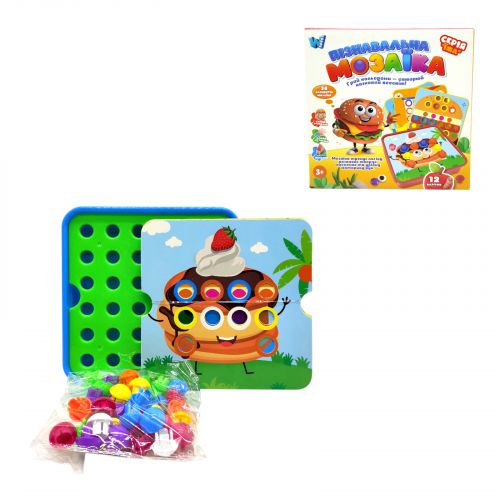 На кожному малюнку є спеціальні отвори, які необхідно заповнити деталями відповідних кольорів. Якщо ж малюку хочеться пофантазувати – можна заповнити барвистими елементами мозаїки отвори ігрової панелі, створюючи власні малюнки. В набор входить: 12 карток з різними зображеннями-шаблонами, а також кольорові деталі мозаїки.