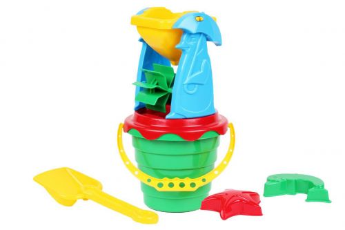 Яскравий пластиковий пісочний набір. У комплекті: відерце (15 х 9 х 14 см), ситечко (14 х 14 см), лопатка, млин і 2 пасочки. Гра з млинком дуже цікава. Вгорі у неї знаходиться ківш, в який можна засипати пісок, або заливати воду, і коли пісочок буде висипатися вниз – активується механізм-крутилка.