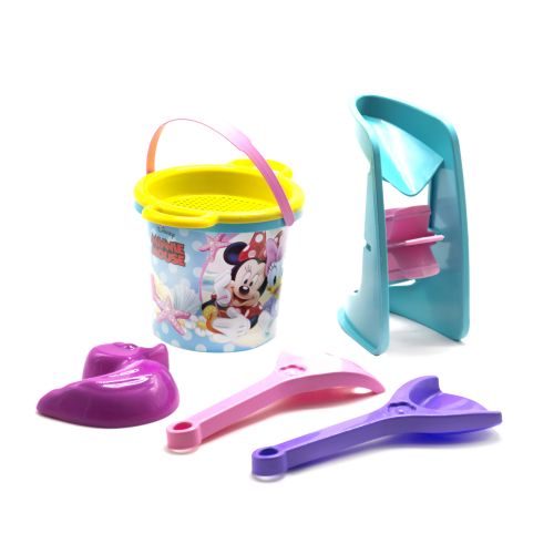Пісочний набір з 6-ти предметів. У комплекті: яскраве пластикове відерце з термонаклейка із зображенням Мінні Маус, ситечко, млинок, лопатка, грабельки і пасочка. Розмір відерця: 12 х 14 см.
