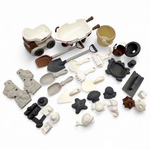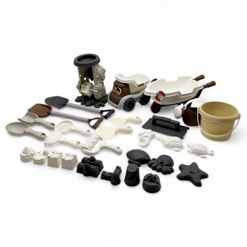 Комплектація: тачка, самоскид, відро, граблі, лопатка, сито, лійка, млин, валик, шпателі, 15 формочок