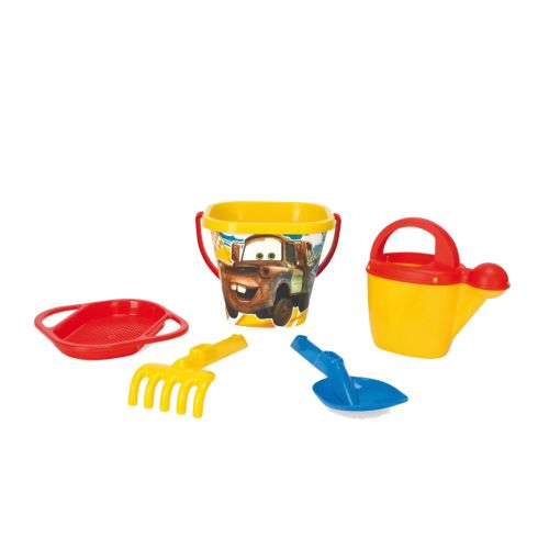 Пісочний набір “Тачки”. У набір входить: відро (16 х 16 х 15 см), лопатка та грабельки (18 см), сито та лійка. У ситі – 2 додаткові отвори для зручного носіння грабельок та лопатки