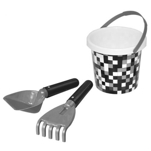 У набір входить відерце, лопатка та грабельки. Відро прикрашене красивою термоналіпкою з піксельним візерунком. Набір стане у нагоді для гри в пісочниці або на пляжі. Виконано із міцного пластику. Довжина інструментів – 17 см. Розмір відерця – 15х14х14 см.