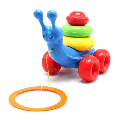 Розвиваюча іграшка “Равлик”. Забавна пластикова іграшка на коліщатках. На спині у равлика знаходиться пірамідка, що складається з 3-х деталей. Також, є ободочок, який можна накидати на шию равлику під час руху. Розмір іграшки – 20х20х16 см. Виконано з якісного пластику. Досить великі деталі.