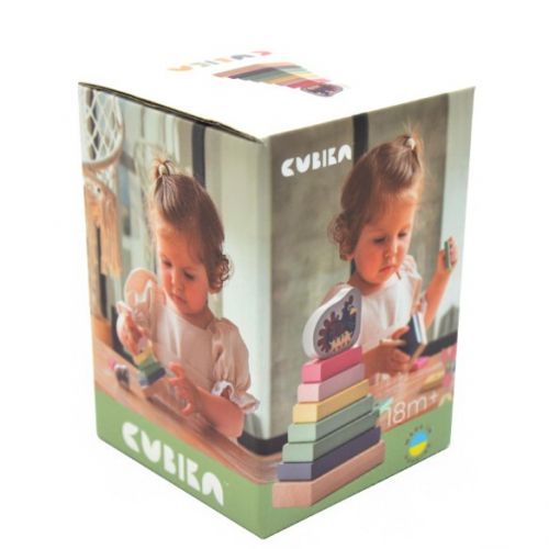 Пірамідка складається з основи та набору дерев’яних деталей, які потрібно розташувати у правильній послідовності (від більшого до меншого). Верхній елемент виконаний у декоративному дизайні, що додає іграшці привабливого вигляду.