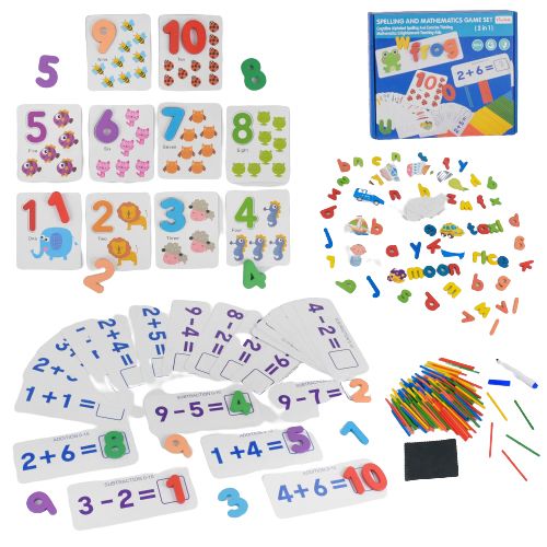 Комплектація: картки з прикладами, картки з цифрами і їх назвами англійською від 1 до 9, дерев’яні цифри і букви англійського алфавіту, рахункові палички, маркер і ганчірочка для його стирання