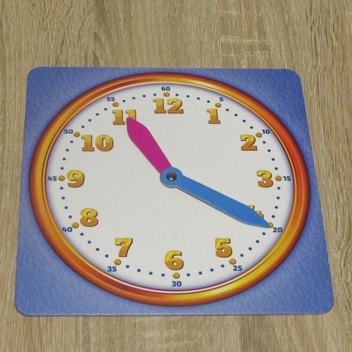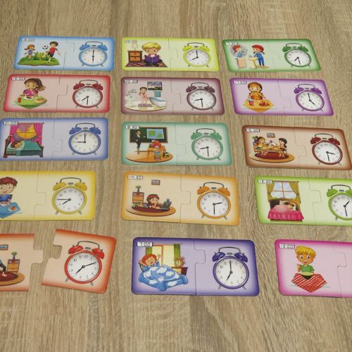 Комплектація: 15 карток з малюнками (30 елементів), циферблат зі стрілками, планшет для відображення часу електронного годинника, 32 цифи, 2 жетона, 8 жетонів-годин, 16 карток-завдань (російською та українською мовами), правила