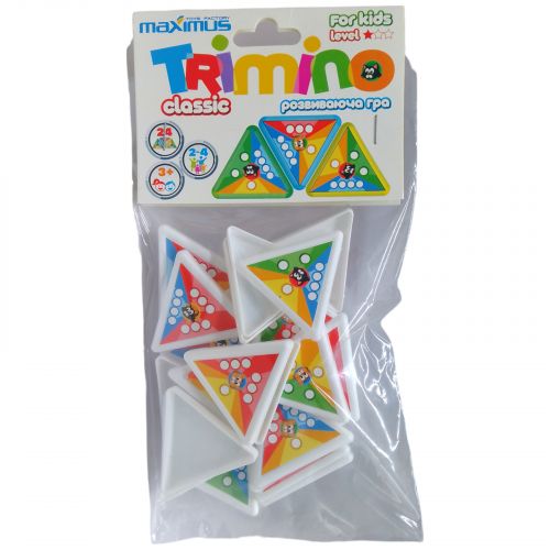 “Тріміно” – це захоплююче трикутне доміно. Правила працюють за тим же принципом, чо і класичним доміно – виграє той гравець, який першим позбудеться кісток. Інші гравці підраховують всі крапки на своїх кісточках: одна крапка – 1 очко. Програє той, хто має більше очок. У комплекті: 24 кістки, які виготовлені із легкого пластику. Розмір однієї кістки: 5х5 см.