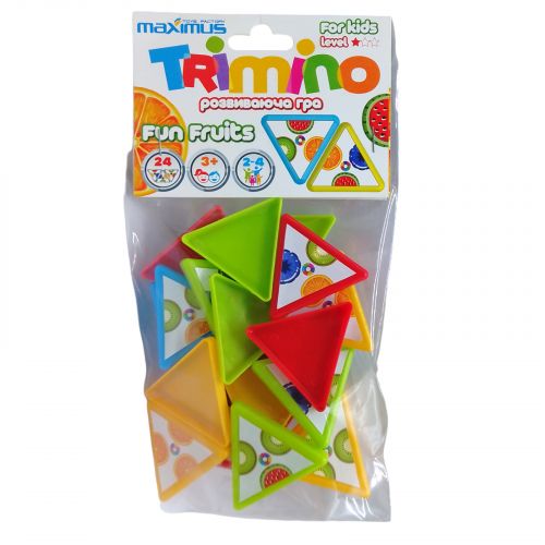 “Тріміно” – це захоплююче трикутне доміно. Правила працюють за тим же принципом, чо і класичним доміно – виграє той гравець, який першим позбудеться кісток. Інші гравці підраховують всі картинки на своїх кісточках: одна картинка – 1 очко. Програє той, хто має більше очок. У комплекті: 24 кістки, які виготовлені із легкого пластику. Розмір однієї кістки: 5х5 см.