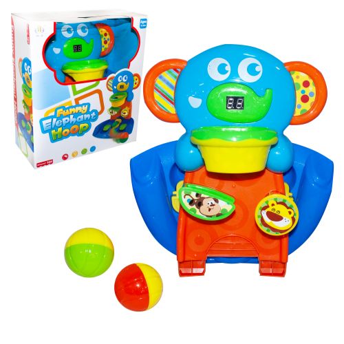 Логіка слоник “Funny elaphant hoop” баскетбол. Мета гри: потрапити м’ячиком в кільце і заробити якомога більше балів (на слоника є лічильник). Матеріал: пластик. Упаковка: коробка.