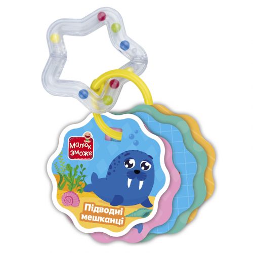 Іграшка-набір, що складається з 6-ти карток з яскравими картинками та прозорого брязкальця, всередині якого видно різнокольорові кульки. Картки та брязкальце скріплені кільцем, яке можна зняти або прикріпити картки до коляски або ліжечка за його допомогою. Граючи з картками, дитина зможе тренувати логічне мислення, дрібну моторику рук, памʼять та уяву. Виконані із міцного картону.