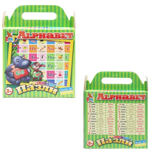 Ігровий набір – пазли, що розвівають, “Англійський алфавіт”. Комплект складається із 60 пазлів. Гра полягає в тому, щоб кожній картці з літерами підібрати пару з відповідним малюнком. Гра розвиває дрібну моторику рук, пам’ять, увагу та навички спілкування. Для дітей віком від 3-х років.