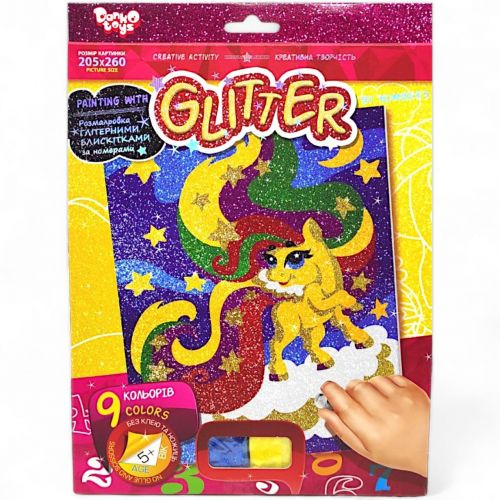 Набір для творчості “Розмальовка глітером”. Набір розвиває фантазію, художній смак і преобщает до мистецтва. На заготівлі нанесені цифри, які відповідають кольорам пакетиків з блискітками. Відокремлюючи захисний шар певного кольору засипте його гліттером.9 квітів.