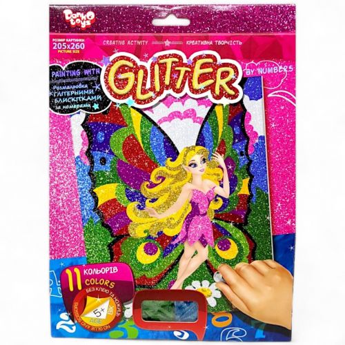 Набір для творчості “Розмальовка глітером”. Набір розвиває фантазію, художній смак і преобщает до мистецтва. На заготівлі нанесені цифри, які відповідають кольорам пакетиків з блискітками. Відокремлюючи захисний шар певного кольору засипте його глітером. 11 кольорів.