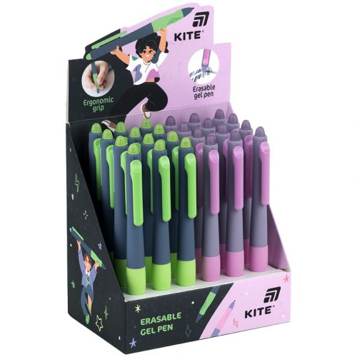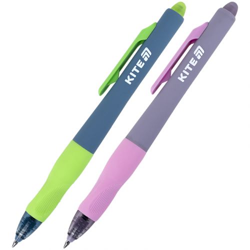 Ручка гелева автоматична “пиши-стирай” має приємний на дотик прогумований корпус та зручний тригранний гумовий грип. Ручка “пиши-стирай” Kite має корисну особливість – є можливість видалення запису з допомогою гумки, вбудованої в корпус. Чорнило стирається не за рахунок механічного стирання і відшаровування частинок гумки, а за рахунок властивостей самого чорнила – чорнило нагрівається під час тертя і зникає при нагріванні до 60 градусів. Таким чином, чорнило видаляється без пошкодження паперу, тому ручка “пиши-стирай” зможе виручити в навчанні та інших сферах, де важливо не допускати виправлень і помарок. Завдяки гелевому чорнилу і високоякісному пишучому вузлу ручка м’яко пише, вимагає мінімального натискання при письмі і залишає чіткий насичений слід. Корпус з якісного пластику.