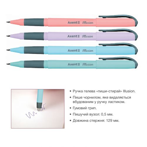 Ручка” “пиши-стирай” має корисну особливість – протягом 12 годин є можливість видалення запису з допомогою гумки, вбудованої в корпус. Чорнило стирається не за рахунок механічного стирання і відшаровування частинок гумки, а за рахунок властивостей самого чорнила – чорнило нагрівається під час тертя і зникає при нагріванні до 60 градусів. Таким чином, чорнило видаляється без пошкодження паперу, тому ручка “пиши-стирай” зможе виручити в навчанні та інших сферах, де важливо не допускати виправлень і помарок. Завдяки гелевому чорнилу і високоякісному пишучому вузлу Premec ручка м’яко пише, вимагає мінімального натискання при письмі і залишає чіткий насичений слід. Має прозорий корпус з якісного пластику і гумовий кольоровий грип для зручності руки. До ручки підходить стержень AGR1096-02-A.